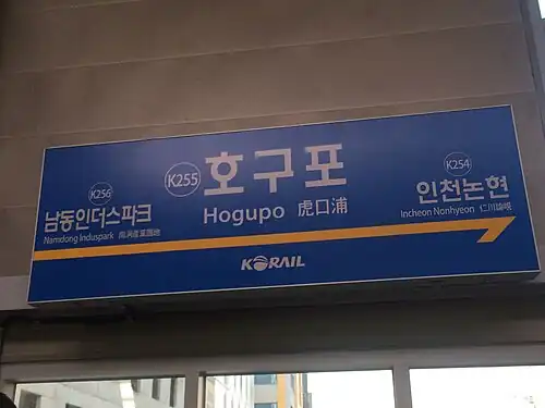 Hogupo Station (Korean호구포역) is a station on the Suin–Bundang Line as a part of the Seoul Metropolitan Subway system as of June 30, 2012. It is located in Nonhyeon-dong, Namdong District, Incheon.[1]