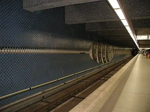 Opened in 1986, Hohe Marter is a U-Bahn station, designed by the artist Peter Angermann. It has a pixel graphical tile mosaic of the horizontally positioned broadcasting tower on its sides.