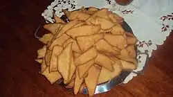 A Hojuela (lit. 'flake'), also called a Hojaldra,[1] is a traditional Spanish and Latin American sweet baked-good originating in Spain. In Latin American countries, especially Colombia, and in Spain, it is commonly made during Holy Week and the Christmas season. Ingredients vary by region, but usually consist of a flour-based batter fried in oil and dusted with sugar.