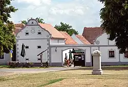 Holašovice is a typical Bohemian village for the Hlubocká Blata area around České Budějovice. It consists of 23 brick farmsteads containing 120 buildings, with a fish pond, a forge, and chapel.[1] The farms were constructed in the South Bohemian Folk Baroque style, in "U" shapes with farmyard in the middle and with their stucco gable ends facing a central broad village green.[1] The buildings date from the 18th to 20th century, with most of them built in the second half of the 19th century. The chapel of St. John of Nepomuk in the village green was built in 1755.[1][2]