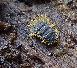 Holacanthella species are usually dark bluish-grey in colour, with distinctive brightly-coloured spine-like projections (called digitations) on their skin. The digitations range in colour from dark to white to yellow to red, even within a single species like H. paucispinosa, in which different colour morphs occur side by side and vary geographically.[1]