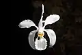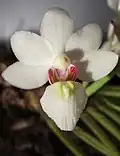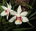 The flowers are white and wide open. The lip is three-lobed. The lateral lobes are erect and dotted adaxially. The central part is spread out over a large area and is parallel to the gynostemium. The lip is shaped to allow potential pollinators to depress the middle lip. The flowers have an elongated spur, which is strongly reduced in the subgenus Brachycentron. The gynostemium has a large scar area. The stamen contains two separate pollina. The stipes connecting the pollina and the adhesive disc (Viscidium) bend in the middle when removed from the rostellum. The rostellum is deeply incised.[4] The number of chromosomes is 2n = 38 in almost all species. Holcoglossum tsii has 76 chromosomes in the diploid chromosome set (2n = 76).[5]