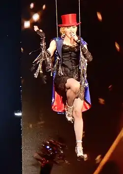 On the MDNA Tour (2012), the song appeared in interlude visuals and was sung live at select shows.[95][96][97][98] During the final show in Córdoba, Argentina Madonna performed it with a megaphone after a generator disrupted the set.[99] Madonna appeared on The Tonight Show Starring Jimmy Fallon on April 9, 2015, and sang "Holiday" using classroom instruments, alongside American band The Roots and host Jimmy Fallon.[100] "Holiday" closed the Rebel Heart Tour (2015–2016), with Madonna dressed in Americana-themed attire and lifted offstage by a harness during the finale.[101][102] The Arizona Republic's Ed Masley called the performance a "triumphant" encore while the Washington Blade's Joey DiGuglielmo found it anti-climactic.[103][104] The Sydney rendition was included on the 2017 Rebel Heart Tour live album.[105] A ukulele version was performed at her cabaret-style Madonna: Tears of a Clown shows (2016), with the singer donning clown attire.[106][107] Most recently, "Holiday" was featured in the Celebration Tour (2023–2024) in a disco-tinged performance interpolating Chic's "I Want Your Love" (1978).[108] Staged beneath a giant disco ball on a club-inspired circular stage, the number featured Bob the Drag Queen as a bouncer.[109][110][111]