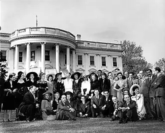 The Hollywood Victory Caravan show was partially inspired by an all-star war bond show at Madison Square Garden on March 10, 1942, organized by Walter Winchell for the benefit of Navy Relief. Plans were then made for a nationwide tour by Hollywood stars. The Santa Fe Railroad donated the use of a special train and this had up to 14 railroad cars which had facilities for rehearsals on board with two portable dance floors, two pianos and ten musicians. Setting off from Los Angeles on April 26, 1942, it traveled to Washington, D.C., where the stars went to a White House Tea Party at the invitation of First Lady Eleanor Roosevelt on April 30 before opening their musical revue extravaganza that night at 8:30 p.m. at Loew’s Capitol. The total “on stage” troupe for opening night consisted of 75 people.[2]