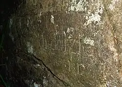 As stated, between 1812 and 1815 seventy or so Napoleonic War army and navy officers were billeted in Sanquhar Burgh.[12] These prisoners had a great deal of freedom and often visited the Crawick Water to swim and walk in the woods. Overlooking the glen near Sarah's Trough is a large and flat faced vertical rock that is covered in graffiti left by the prisoners and other visitors.[10] Much of it is now hard to read, although the words 'Luogo di Delizia'[13] are still discernable,[9] being in the Italian language and meaning 'delightful place'.[14] The dates 1812 and 1814 are visible,[15] a possible coat of arms, some well-carved initials and the French word 'Souvenir' that can mean 'memory, remembrance, recollection, keepsake or memento'.[10]