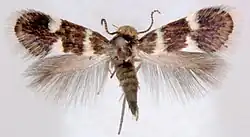 The wingspan is 3.9–4.9 mm for males and 4–4.6 mm for females. The forewings of the males are grey brown, slightly irrorate, caused by scales being dark tipped and paler at the base. There is a silver-white pattern on the forewings, consisting of a triangular dorsal spot at one-fourth, usually associated with a minor spot of just a few scales at the costa, that may be joined to the dorsal spot, or even completely absent. There is a second triangular dorsal spot at 1/2, reaching almost to the middle of the wing and a triangular costal spot just beyond the middle, always separate. The females have the scales almost uniformly dark fuscous with a purplish tinge, resulting in darker, velvety wing colour and contrasting silvery-white pattern. The first costal and dorsal spots are joined to form a narrow fascia, wider at dorsum. The second dorsal and costal spots are as in males. The species is multivoltine, with adults on wing from September to early May.