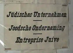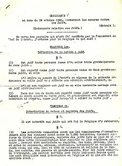 On 23 October 1940, the German Military Administration adopted anti-Jewish legislation for the first time.[10] The new laws, similar to the Nuremberg Laws adopted in Germany in 1935, coincided with the adoption of similar legislation in the Netherlands and in France.[10] The laws of 28 October forbade Jews to practice certain professions (including the civil service) and forced Jews to register with their local municipality.[11] On the same date, the German administration announced a definition of who was regarded as Jewish. Jewish-owned shops or businesses had to be marked by a sign in the window, and Jewish-owned economic assets had to be registered.[11] From June 1940, a list of Jewish businesses had already been drawn up in Liège.[12]