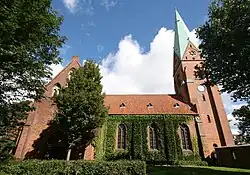 The church is built in red brick in the National Romantic style.[1]