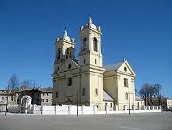 The monks of the Order of Carmelites bought several plots of land for the monastery in Kaunas near the Nemunas river in 1706. Some years earlier, the new church was sanctified nearby in 1685. It was consecrated in 1700.[1] The church was built in the late baroque style. It is a two tower building of Latin cross shape. The painting in the main dome represents the prophet Elijah. It was created in the second half of the 18th century. After the spread of cholera epidemic, Tsarist Russian government established the hospital on the first floor of the monastery in 1831. The church and the monastery were closed in 1845 and since when were used as a store house for carts and harness. At the same time the interior of the church was vandalized.