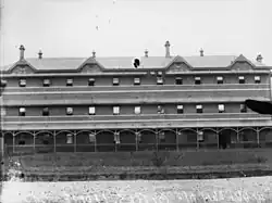 The original laundry consisted of a single-storeyed section at the eastern end of the dormitory building containing ironing and mangling rooms, and a southern wing which housed the sorting room and washhouse. In 1899 a northern wing in brick with a timber verandah was added. It was designed as a model ironing room equipped with a purpose-built recess which housed tiered stoves capable of heating sixty-eight irons. Large roller presses were in use by 1902 and electric irons were installed in 1917. From the outset the laundry employed steam-driven facilities, initially powered by a gas-operated boiler. An oil burner was installed in the 1980s, and the old boiler-room chimney was demolished.[1]