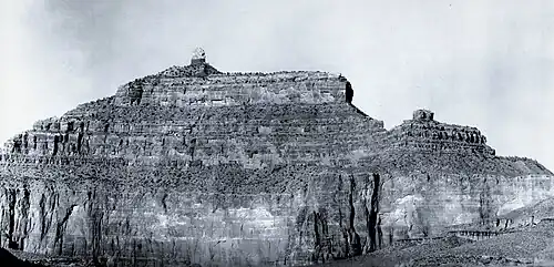 Holy Grail Temple was originally named "Bass Tomb" in 1891 by Virginia Dox, for William Wallace Bass, who was Dox's guide into the Grand Canyon at this location.[4][5] Impressed by her, Bass named nearby Dox Castle shortly after she left.[6] However, at the suggestion of the U.S. Geological Survey, Bass Tomb was renamed "Holy Grail Temple", for the Holy Grail of the Legend of King Arthur, in keeping with the naming theme for other geographical features in the vicinity, e.g. King Arthur Castle, Guinevere Castle, Elaine Castle, Excalibur, Gawain Abyss, Bedivere Point, Lancelot Point, and Galahad Point.[2] This feature's present name was officially adopted in 1908 by the U.S. Board on Geographic Names.[2]