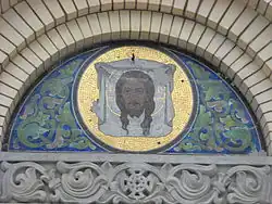 The architecture of the building emulated Greek temples from the early centuries of Christianity. The second source of inspiration for the architect was the Romanesque Revival style. Piotr Paszkiewicz notes that a particular element referencing this style is the modest main entrance, featuring a minimal number of half-columns and the use of pseudo-triforiums. Another part of the temple reminiscent of this style is the apse, decorated with a single half-column with a capital adorned with plant motifs.[1] The building was modestly decorated externally, with only the mosaic-Mandylion above the side entrance surviving to this day.[1]