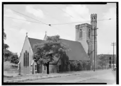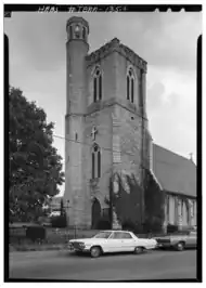The congregation's building is constructed in the Gothic Revival style and was listed on the National Register of Historic Places in 1972 primarily for its architectural significance. The plans were originally drawn up in 1851 by the duo of Frank Wills and Henry C. Dudley, architects from New York City well known for designing churches of this style throughout North America. The building is constructed of native limestone ashlar and features a central square tower adorned with battlements and two sets of pointed arch stained glass windows, one on each level.[6] An electric cross donated by member Alfred Galloway some time during Rev. Cochran's rectorship (1928–1943) is hung just above the lower set of windows.[3] A pair of double red doors are located in the center of the tower, hung in 1952 as part of the church's centennial celebration.[2] The central tower was not completed immediately after the laying of the cornerstone in 1852 but rather over the course of several years, only reaching the same height as the roof of the nave during the rectorship of George Carroll Harris (1859–1862).[3]