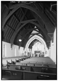 The narthex of the church is located at the base of the tower, and there is a large bell tower chamfered into the southwest corner of the tower. The belfry atop the bell tower was originally topped with battlements similar to those atop the square tower, but those were removed some time after 1941. The original plans called for a polygonal spire to top the bell tower, but it was never built.[6] The nave of the church is approximately 70 feet (21 m) by 35 feet (11 m),[6] and its exterior is segmented lengthwise by several buttresses, between each lancet windows are located. The roof of the nave is steeply gabled and constructed of varnished cedar wood covered originally with seamed tin but later with more contemporary roofing material.[3]