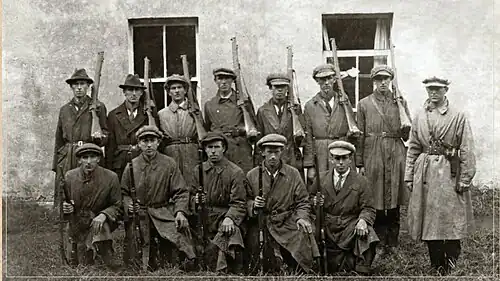 The soldiers set up camp in a little old abandoned house nearby, throwing a large tarpaulin over the roof of the house for shelter.[7] They placed two sentries on the road while the rest of the guard retired to the abandoned house where they lit a fire in the ruin's fireplace.[7][5] Martin Forkhan, a local IRA volunteer, happened upon the scene of the crashed lorry and immediately notified the Ballyhaunis Battalion Commandant, Patrick Kenny, of the situation. Kenny issued instructions to mobilise all officers in the Ballyhaunis Battalion area.[8]