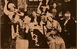 The writer of the scenario is unknown, but it was most likely Lloyd Lonergan. He was an experienced newspaperman employed by The New York Evening World while writing scripts for the Thanhouser productions.[2] The film director is unknown, but it may have been Barry O'Neil. Film historian Q. David Bowers does not attribute a cameraman for this production, but at least two possible candidates exist. Blair Smith was the first cameraman of the Thanhouser company, but he was soon joined by Carl Louis Gregory who had years of experience as a still and motion picture photographer. The role of the cameraman was uncredited in 1910 productions.[3] The cast credits are unknown, but many 1910 Thanhouser productions are fragmentary.[4] In late 1910, the Thanhouser company released a list of the important personalities in their films. The list includes G.W. Abbe, Justus D. Barnes, Frank H. Crane, Irene Crane, Marie Eline, Violet Heming, Martin J. Faust, Thomas Fortune, George Middleton, Grace Moore, John W. Noble, Anna Rosemond, Mrs. George Walters.[5] A surviving film still gives the possibility of identifying eight actors.[6]