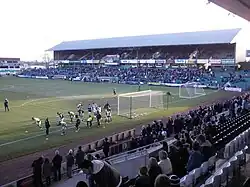 After undergoing considerable development in the 1920s and 1930s, the ground suffered heavy damage in World War II. It reopened in time for the resumption of the Football League in 1945, and underwent further improvements in the 1950s, including the installation of floodlights and a new double-decker grandstand. The ground remained relatively unchanged until 2001, when construction of three new all-seater stands began.[5] Temporary solutions saw the stadium become all-seater in the summer of 2007,[6] before the Mayflower Grandstand, the oldest part of the ground, was redeveloped in 2019.