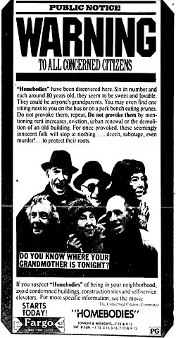 - ^ Dietrich, Jean (August 31, 1974). "It's hard to insult sufficiently a movie as bad as 'Homebodies'". Courier Journal. p. A9 – via Newspapers.com.
