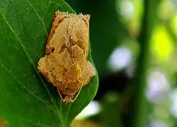The tea tortrix has a life cycle which takes about 35 to 49 days to complete. Immediately after copulation, adult females lay 100 to 150 clusters of egg on the surface of the leaves of host plant. Eggs are scaly and minute with overlapping appearance. After 6 to 8 days of laying, larvae hatch from the eggs. Larvae complete five instars and become fully grown after 3 to 4 weeks. Fully grown caterpillar is about 22 mm in length. Pupation occurs in the folds of the leaves. After 6–8 days of pupal life, adult emerges.[7]