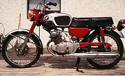 The Honda CB175 is a standard motorcycle made by Honda from 1969 to 1973.[1][3] It had a 175 cc (10.7 cu in) four-stroke, straight-twin engine with a single overhead camshaft, two valves per cylinder, dual slide-valve carburetors, and dual exhausts. It was also equipped with a five-speed gearbox, 12-volt electrics, kick and electric start, front and rear drum brakes, turn signals, speedometer with trip meter (1972 and later models), and tachometer, and was rated at 20 bhp (15 kW).[3] An update in 1972, brought a more rounded gas tank and changes to the air box covers, along with some other minor trim changes. The CB175 was discontinued for 1974 and replaced by the CB200, a similar bike already in production. Although not technologically remarkable, Honda's small twins of the 1960s and 1970s were among their best sellers.[4] Dual sport scrambler CL175, SL175 enduro style and touring CD175/CA175 versions were also produced.[1]
