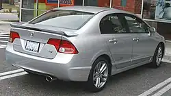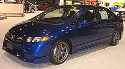 The 2008 model year also brought into production the limited-edition 2008 Civic Mugen Si Sedan, which was announced at the 2007 SEMA Show.[18] The Mugen sedan came only in Fiji Blue Pearl, and featured a higher-flowing cat-back exhaust, track-tested sport suspension, an exclusive Mugen grille, an exclusive shift knob, Mugen Si badges on the exterior and interior, Mugen forged GP wheels, and a Mugen body kit custom designed for the American trim. Production was limited to only 1000 units.[19] Testing by Car and Driver magazine determined that the acceleration of the Mugen Si was roughly equivalent to that of the standard Civic Si coupe.[20]