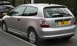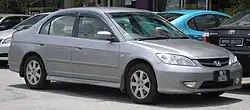 The seventh-generation Honda Civic is an automobile produced by Honda from 2000 until 2005. It debuted in September 2000 as a 2001 model. Its exterior dimensions stayed similar to the outgoing predecessor, with interior space significantly increased, bumping it up to the compact car size designation. A notable feature was the flat rear floor that gave better comfort to the rear seat passengers. This generation abandoned the front double wishbone suspension, used previously from fourth to sixth generations, replacing it with MacPherson struts. This generation was the last to offer 4WD variants.