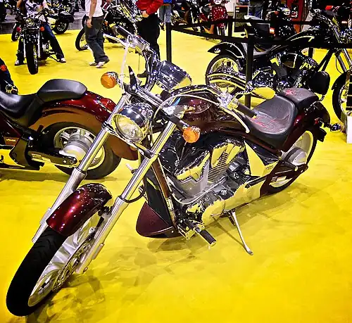 The Honda Fury was the first production chopper from a major motorcycle manufacturer (Honda).[7][9] In a break with tradition, the Fury was the first chopper to have an anti-lock braking system[10] The Fury's styling has been likened to custom-made choppers from Paul Teutul Sr. or Arlen Ness.[8][11] The Fury has been sold not only in North America, but internationally as well, although in some markets Honda eschewed the Fury name and offered the bike simply by its model ID: VT1300CX.[12]