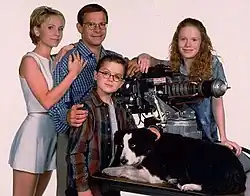The main characters of the TV series (from left to right), Diane, Wayne, Nick, Amy Szalinski, and the family dog, Quark (portrayed by Mattise). Photographed by Charles Bush.