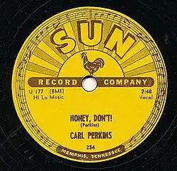 "Honey Don't" is a song written by Carl Perkins, originally released on January 1, 1956[2] as the B-side of the "Blue Suede Shoes"[1] single, Sun 234. Both songs became rockabilly classics. Bill Dahl of Allmusic praised the song saying, "'Honey Don't' actually outclasses its more celebrated platter-mate in some ways."[3] It has been covered by more than 20 other artists, including the Beatles, Ronnie Hawkins and Johnny Rivers.[4] The song has appeared in films such as The Prince of Tides, Diner, and Perfect Sisters.