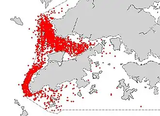 Despite having intensive research efforts conducted in Hong Kong's territorial portion of the Pearl River Estuary in the preceding seven years, only a years' worth of effort was dedicated to acquiring data about the rest of the estuary. The contrasting surveillance effort between the Hong Kong and Mainland Chinese waters has hindered the general understanding of the entire Pearl River Estuary population of Chinese white dolphins.