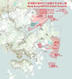 Hong Kong UNESCO Global Geopark (Chinese: 香港聯合國教科文組織世界地質公園), formerly Hong Kong National Geopark (香港國家地質公園), was inaugurated on 3 November 2009. It is a single entity of land area over 150 km2 across parts of the eastern and northeastern New Territories.[1] On 18 September 2011, UNESCO listed the geopark as part of its Global Geoparks Network.