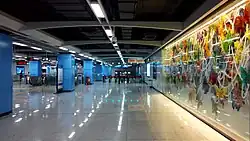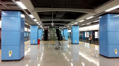 Hongling South station (Chinese: 红岭南站; pinyin: Hónglǐng Nán Zhàn) is a metro station of Shenzhen Metro Line 9. It opened on 28 October 2016. This station is located under the southeast of the intersection of Hongling South Road and Shennan East Road.[1] The station is an indirect interchange with Line 1 and Line 2 at Grand Theater Station.[2]