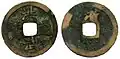 The Hongwu Tongbao (simplified Chinese: 洪武通宝; traditional Chinese: 洪武通寶; pinyin: Hóngwǔ tōng bǎo; lit. 'vastly martial circulating treasure' Japanese: Kōbu Tsūhō) was the first cash coin to bear the reign name of a reigning Ming dynasty Emperor bearing the reign title of the Hongwu Emperor. Hongwu Tongbao cash coins officially replaced the earlier Dazhong Tongbao (Chinese: 大中通寶) coins, however the production of the latter did not cease after the Hongwu Tongbao was introduced.[2] The government of the Ming dynasty placed a greater reliance on copper cash coins than the Yuan dynasty ever did, but despite this reliance a nationwide copper shortage caused the production of Hongwu Tongbao cash coins to cease several times eventually leading to their discontinuation in 1393 when they were completely phased out in favour of paper money. In the year 1393 there were a total of 325 furnaces in operation in all provincial mints of China which had an annual output of 189,000 strings of cash coins (or 1,890,000 cash coins annually) which was merely 3% of the average annual production during the Northern Song dynasty.