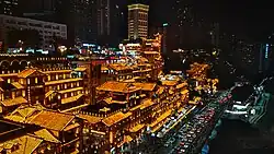 Hongya Cave, also known as Hongya Dong (Chinese: 洪崖洞; pinyin: hóng yá dòng; lit. 'cave of the flooded cliff') is an 11-story stilt-building complex in the main commercial district of Jiefangbei in the city of Chongqing, China. It comprises a series of structures built into the hillside along the southern bank of the Jialing River,[1] and is one of the most popular tourist attractions in the city.[2]