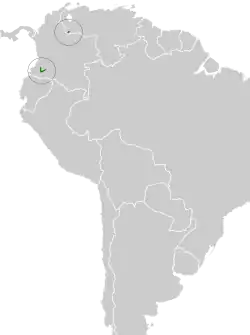 "The range of Hooded Antpitta is patchy and poorly known, with large gaps between known populations, though new localities still being discovered."[5] The nominate subspecies is found in Colombia, in the Western Andes of Valle del Cauca and Cauca departments, on the west slope of the Central Andes in Valle del Cauca and Antioquia departments, and on the west slope of the Eastern Andes at the head of the Magdalena River Valley in Huila Department and possibly further north as well. There are also nineteenth century records near Medellín in Antioquia. Subspecies G. c. venezuelana is found on the east slope of Colombia's Eastern Andes in eastern Cundinamarca Department and slightly into the northwestern Venezuelan states of Táchira and Apure. The species inhabits the undergrowth of humid subtropical montane forest. In elevation it occurs between 1,500 and 2,800 m (4,900 and 9,200 ft) in Colombia and between 1,500 and 2,550 m (4,900 and 8,400 ft) in Venezuela.[5][6][7]