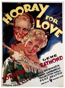 Hooray for Love is a 1935 American musical comedy film directed by Walter Lang from a screenplay by Lawrence Hazard and Ray Harris, which was based on an unpublished story by Marc Lachmann titled The Show Must Go On. Starring Ann Sothern and Gene Raymond, they were supported by Bill Robinson, Fats Waller, Maria Gambarelli, Thurston Hall, and Pert Kelton; the film was released by RKO on June 14, 1935, with music by Jimmy McHugh and lyrics by Dorothy Fields. The film's musical director was Alberto Colombo.
