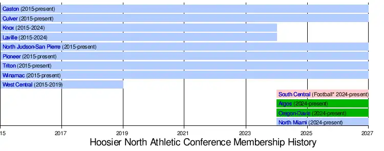 - 2023: The Hoosier North Athletic Conference announced on May 18 that Argos and Oregon-Davis would be joining the conference. It is important to note that neither of these schools has a football program and would participate in all other sports aside from football.[5]