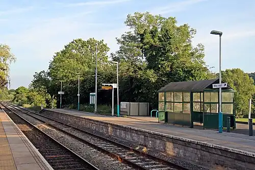 The station was originally known as Caergwrle, with the name changing to Hope Village on 1 January 1899,[2] to differentiate it from Caergwrle and Hope Exchange stations, with the latter being just north of Penyffordd. The station had a 17-lever signal box at the northern end of the Wrexham-bound platform, with an adjacent third through line around the outside of the platform, and a goods yard with a cattle pen and one-ton crane.[2] The signal box was opened in 1885 and closed on 1 August 1965, and the goods yard closed on 4 May 1964.[5] The station buildings here have been demolished since the station became unstaffed in 1969.
