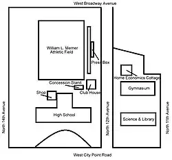 The athletic field, built in the 1930s as a Works Progress Administration project, is sited on the north side of the complex directly behind the main school building.[3] In 1965, the field was renamed in honor of William "Bill" Merner (1915–1965), a Hopewell High School graduate and Blue Devils football player who later returned to the school and coached the football team from 1949–1958.[18] The field features two goal posts, a metal scoreboard and concrete track and sidewalks. Concrete bleachers, believed to be built in the late 1930s, are on the east side of the field and modern, metal bleachers are on the west side. A concrete wall built in the late 1930s surrounds the perimeter of the field. It features capped pilasters approximately every six feet. A parking area is sited just north of the field.[3]