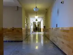The original layout of the basement included classrooms, labs, the cafeteria and kitchen, offices, locker rooms and a boiler room. The main floor featured classrooms, restrooms, the library, principal's office and superintendent of school's office. The auditorium and maple wood stage is located in the center of the building. The upper portion of the auditorium including the gallery is on the second floor. This floor also featured classrooms, a teacher's lounge and the study hall.[3]