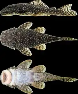 Hopliancistrus tricornis is the only species of the genus Hopliancistrus of suckermouth armored catfish.[2] This species reaches a length of 10.4 centimetres (4.1 in) SL. It is endemic to Brazil and can be found in the Tapajós and Xingu River basins.[3] This species appears similar to members Lasiancistrus, however it lacks the synapomorphies and has five rows of plates on the caudal peduncle instead of three like those found in Lasiancistrus.[4] It is characterized by three stout, strongly curved odontodes on either side of the head in males.[4]