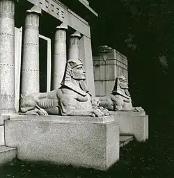 In 1919, Henry Ford bought out the Dodge brothers' shareholdings in Ford Motor Company for $25 million. In January 1920, Horace's brother, John, died during the influenza epidemic.[9] He was interred in the family's Egyptian-style mausoleum in Detroit's Woodlawn Cemetery guarded by two Sphinx statues.[10] Having also contracted the flu that December following several relapses, Horace also died from complications of the disease resulting in pneumonia and cirrhosis of the liver at the age of 52 in Palm Beach, Florida.[11] He was interred with his brother in the same mausoleum. His widow outlived him by fifty years.[4]