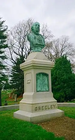 Although Greeley had requested a simple funeral, his daughters ignored his wishes and arranged a grand affair at the Church of the Divine Paternity, later the Fourth Universalist Society in the City of New York, where Greeley was a member. He is buried in Brooklyn's Green-Wood Cemetery. Among the mourners were old friends, Tribune employees including Reid and Hay, his journalistic rivals, and a broad array of politicians, led by President Grant.[123]