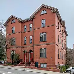 Throughout his childhood, Mann experienced a variety of educational experiences from a vocational education working on the family farm to religious education. Mann came to see education as an essential component of a healthy childhood.[6] From age ten to age twenty, he had no more than six weeks' schooling during any year,[7] but he made use of the Franklin Public Library, the first public library in America. He enrolled at Brown University when he was twenty years old and graduated in three years[8] as valedictorian (1819). The theme of his oration was "The Progressive Character of the Human Race."[7] He learned Greek and Latin from Samuel Barrett,[9] who later became a Unitarian minister.[10]