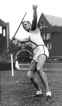 Odell repeated as IC4A champion in 1934, defeating Stanford's Johnny Mottram, who had been the favorite.[7] The following week, aided by a tailwind,[8] he threw 221 ft 11 in (67.64 m) at the N.Y.A.C. Games; it was the best throw by an American that year, within a foot of James DeMers's American record,[8][9][10] and remained a meeting record until 1963.[11] Despite this, Odell only placed fourth at the 1934 national championships[6] and fifth at the NCAA championships.[12]