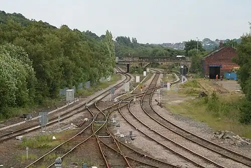 In 1850 the Lancashire and Yorkshire added a new line, from Wakefield to Barnsley, and the town acquired a second station, Horbury Junction, about a mile to the east, where trains from the new Barnsley branch joined the existing line. But it was not as convenient for the centre of the town, so trains on the east–west line continued to stop at the original station instead. A connecting curve to the Barnsley line from the Horbury and Ossett side was added in 1902, completing the triangle; but it attracted little traffic after 1939, and passenger services from the west were suspended in 1962. The chord continued to be used by some freight traffic, and occasionally used for parking the Royal Train, but was eventually severed in 1991.[1] The eastern side of the triangle continues to be used by Hallam Line trains from Leeds to Sheffield. The original Horbury Junction station closed in 1929; although for a time a third station was open, on the main line a little closer to the town, to service the large railway wagon works of Charles Roberts and Co. which grew up in the land between the two lines.