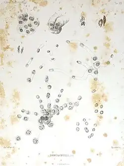 The type species of Hormotila, Hormotila mucigena, as originally illustrated by Borzì, was a heterogenous assemblage of different algae. Some of his figures showed cells in laminated layers of mucilage, reminiscent of Gloeocystis or Urococcus. In other figures, the cells were in branched, tubular layers of mucilage. Still other figures showed figures reminiscent of Oocystis, Ankistrodesmus or Elakatothrix. In 2016, Daniel E. Wujek and Michael J. Wynne redefined the genus by emending the description of the type species to only include the second sense, i.e. cells in branched tubes.[2]