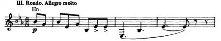 The premiere of Strauss's opera Capriccio was on 28 October 1942. Strauss wrote "My life's work has been concluded with Capriccio. Whatever notes I scribble down now have no bearing on musical history."[1] A couple of days later he drove to Vienna where he was to stay for over 6 months.[2] The horn concerto seems to have been written very quickly: his note book indicates that the draft was finished on 11 November, and the final score two weeks later on the 28th (he added a note at the end "In the beautiful house at Vienna"). The autograph score indicates that it is dedicated "To the memory of my father", although this did not make it into the published version. The speed of composition may reflect that it had been on his mind for sometime, as the principal horn player at Munich, Professor Josef Suttner, had asked him years before to write a second concerto.[3] Strauss also mentioned the second concerto in a program list written in 1941.[4][5]