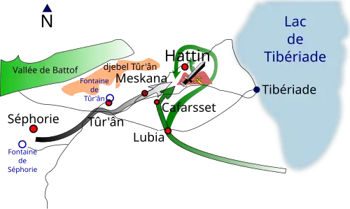 Throughout the night, the Muslims further demoralized the crusaders by praying, singing, beating drums, showing symbols, and chanting. They set fire to the dry grass, making the crusaders' throats even drier.[34] The Crusaders were thirsty, demoralized and exhausted. The Muslim army, by contrast, had a caravan of camels bring goatskins of water up from Lake Tiberias (now known as the Sea of Galilee).[35]