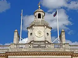 The clock is sited in the turret above the main archway; it has two faces, one facing Whitehall and the other, Horse Guards Parade, each dial being 7 feet 5 inches (2.26 metres) in diameter. It strikes the quarter-hours on two bells. Originally made by Thwaites in 1756, the clock was rebuilt in 1815–16 by Benjamin Lewis Vulliamy, the clockmaker to King George III.[8] Prior to the completion of the clock of Big Ben in 1859, the Horse Guards Clock was the main public clock in Westminster. A dark stain above the Roman number two on the clock face is supposed to mark the time of the execution of King Charles I in 1649, which took place in the roadway outside Horse Guards.[9] The annual ceremony of Trooping the Colour commences when the Horse Guards Clock strikes eleven.[10]